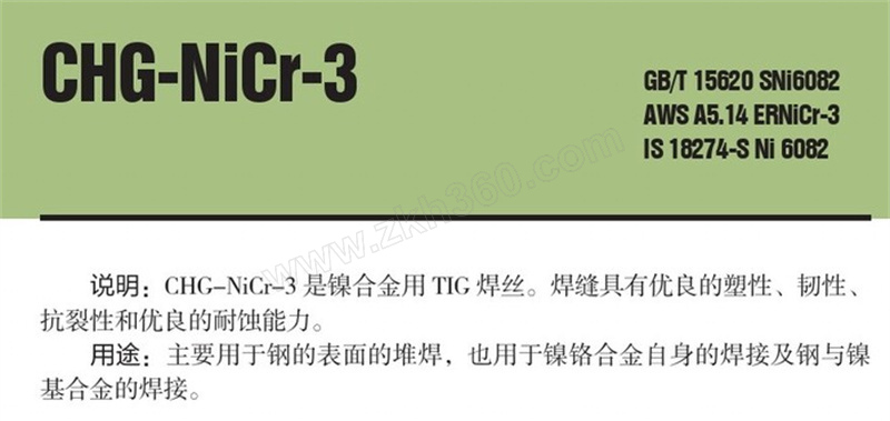 ·CHG-NiCr-3是镍合金用TIG焊丝 ·焊缝具有优良的塑性、韧性、抗裂性和优良的耐腐蚀能力