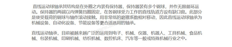 ·作无限直线运动的系统。负荷滚珠和淬火传动轴因为是点接触,容许载荷较小,但直线运动时,摩擦阻力小,精度高,运动快捷。