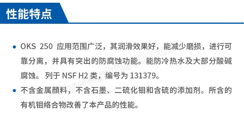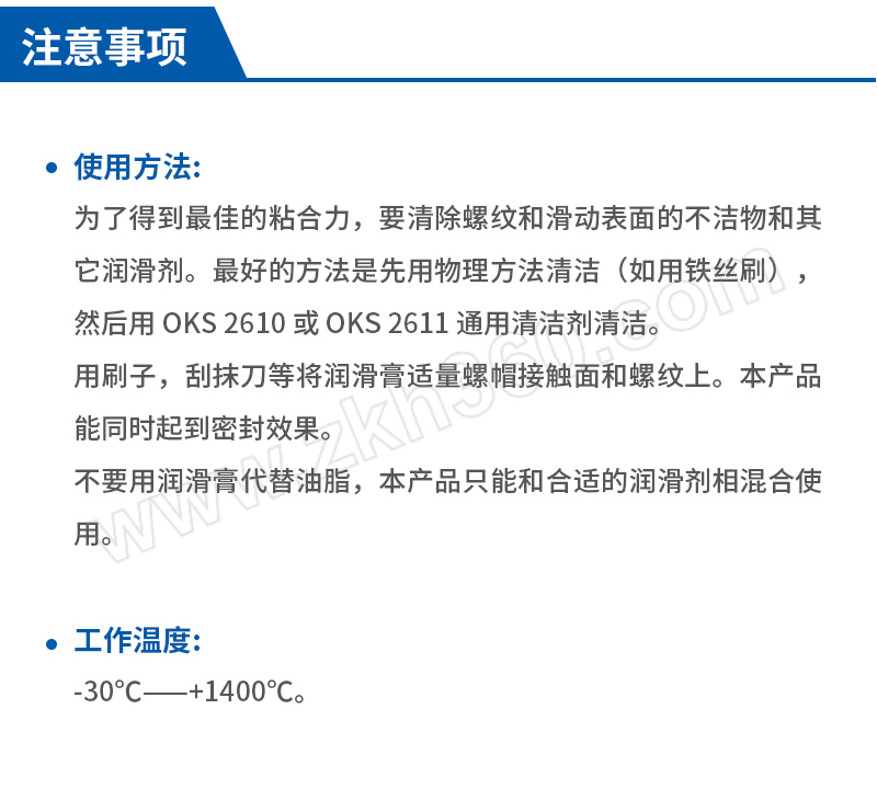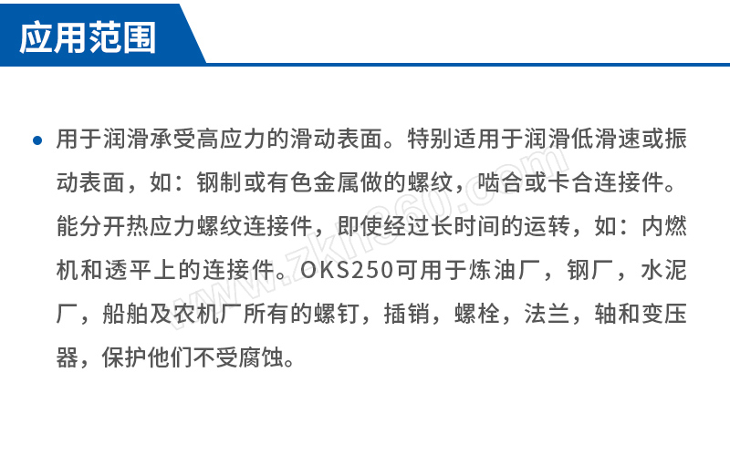 ·润滑高负荷的滑动面,特别是用于低滑动速度或振荡运动条件下,例如高合金钢材或有色金属的螺纹连接、插头链接、插销接头; ·对温度有一定要求的螺纹连接表面分离,例如用于内燃机和涡轮机中; ·对螺杆、销钉、螺栓、法兰、主轴和密接件提供防腐蚀保护; ·可用于不锈钢连接件。