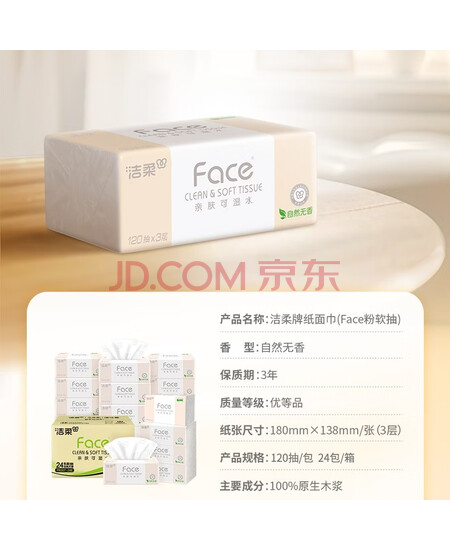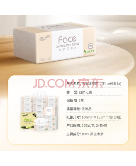 包装清单: 洁柔抽纸 粉Face柔韧3层120抽*24包 亲肤柔软 原生木浆面巾纸 整箱