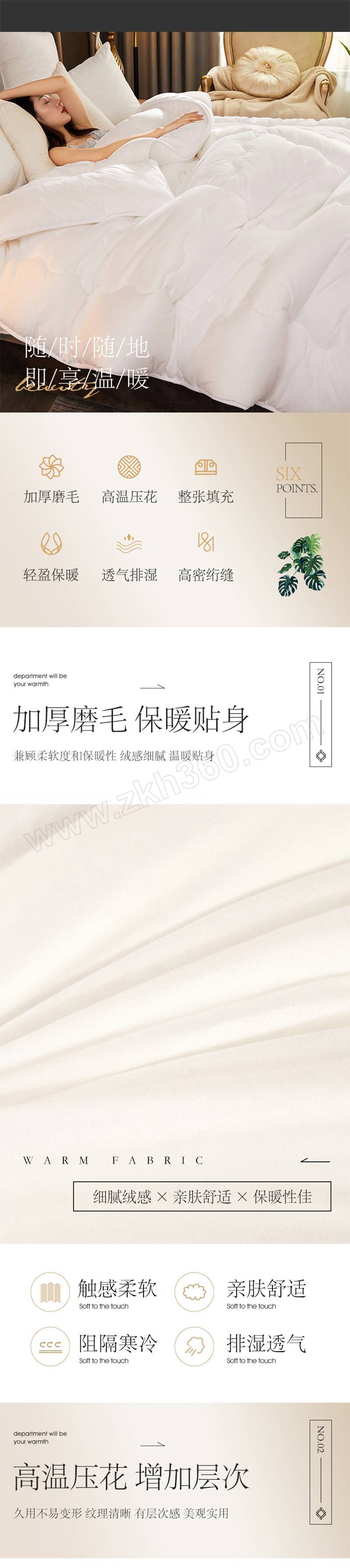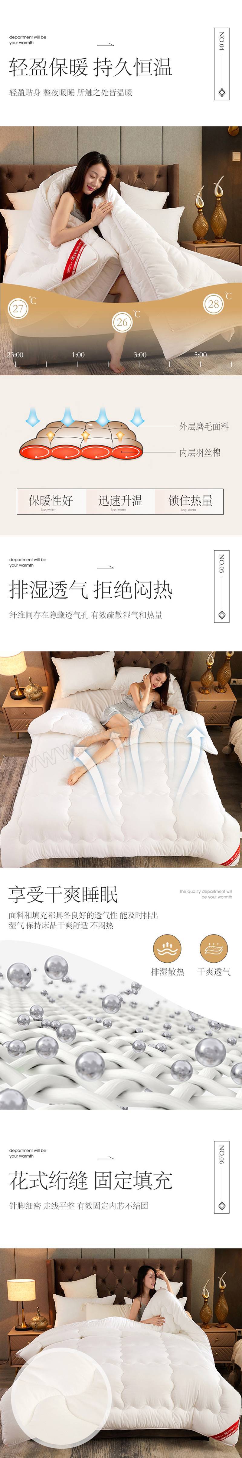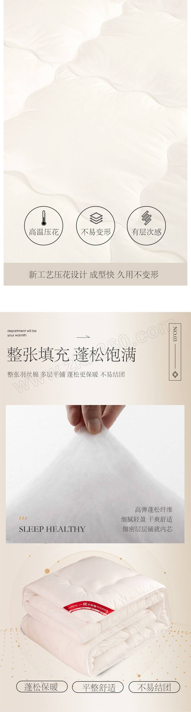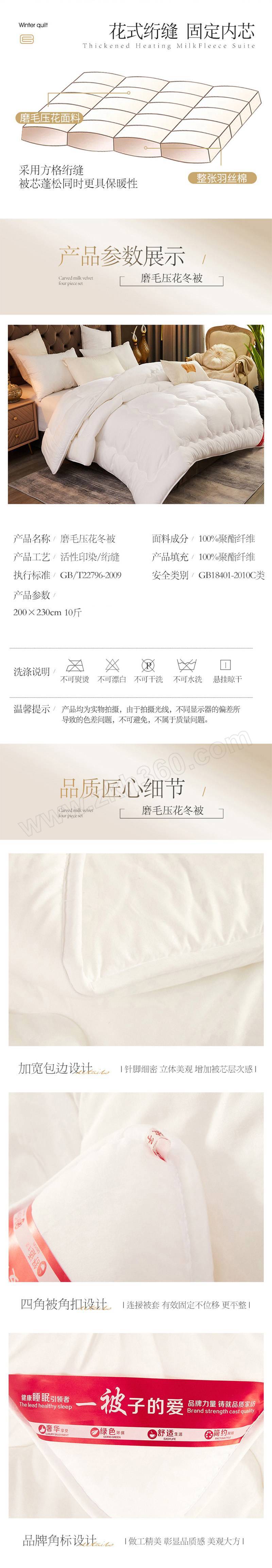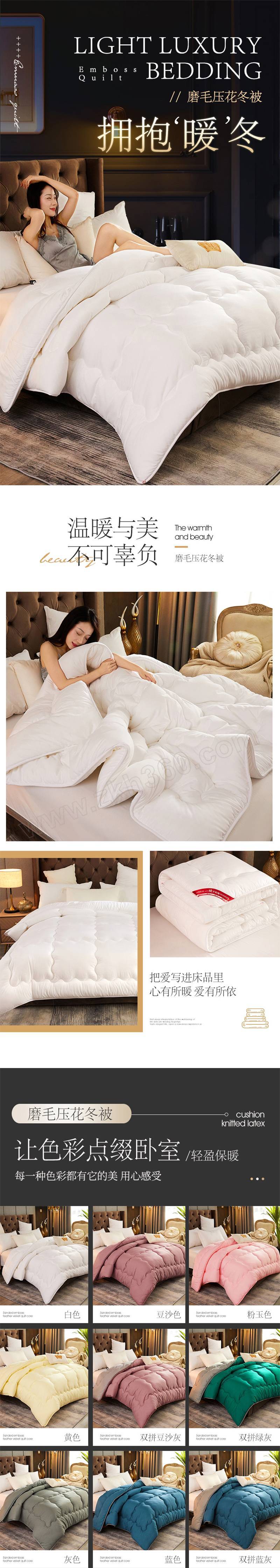 ·产品颜色:白色 ·产品尺寸:200cmx230cm10斤 ·磨毛压花冬被,整张羽丝棉,高弹蓬松纤维,细腻轻盈,干爽舒适,细密层层铺就内芯,蓬松更保暖,不易结团,加厚磨毛保暖贴身,兼顾柔软度和保暖性,绒感细腻温暖贴身,高温压花增加层次,久用不易变形,纹理清晰,有层次感,美观实用,轻盈贴身,整夜暖睡,所触之处皆温暖。
