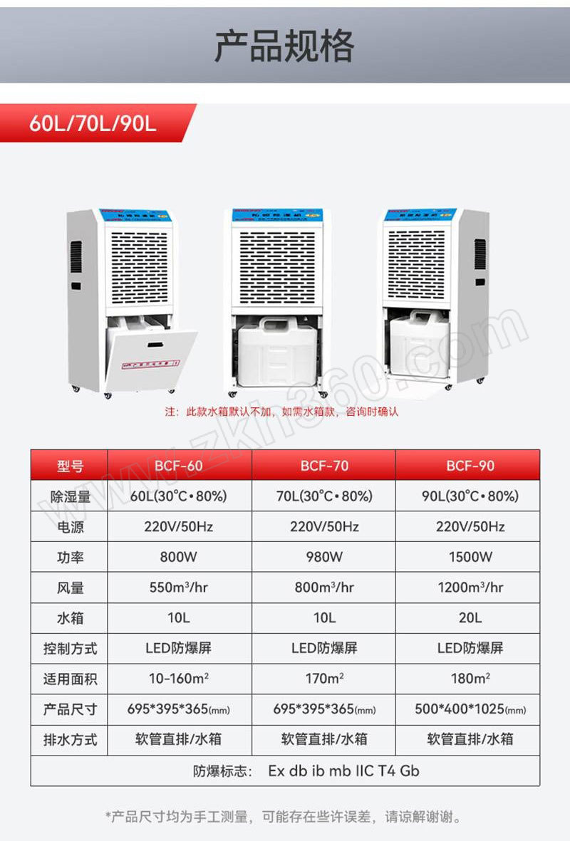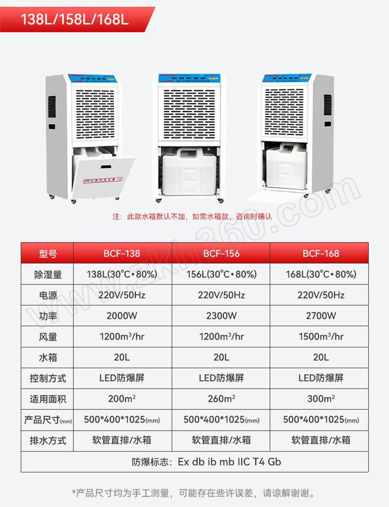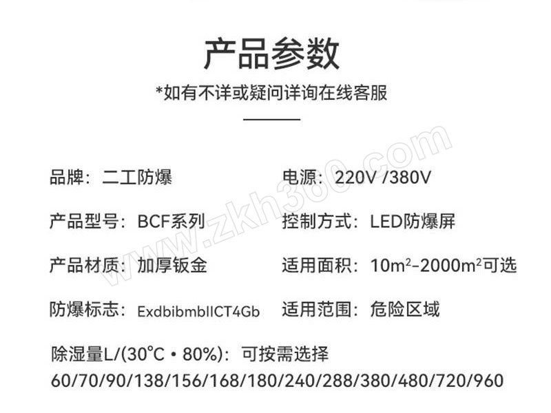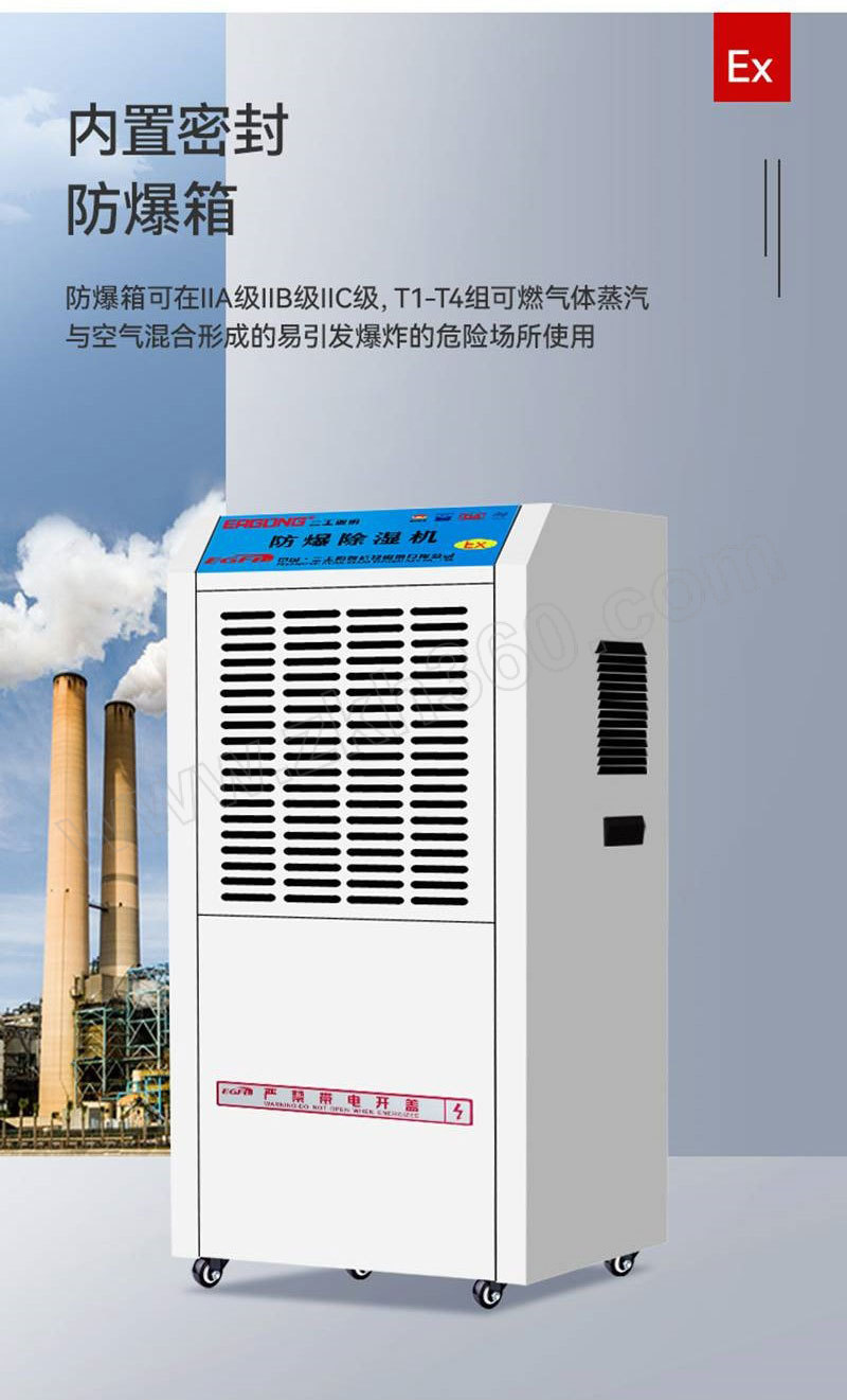 | 核心规格 | 除湿量180L/D(30℃×80%) 380V 软管连排 Ex db ib mb IIC T4 Gb |