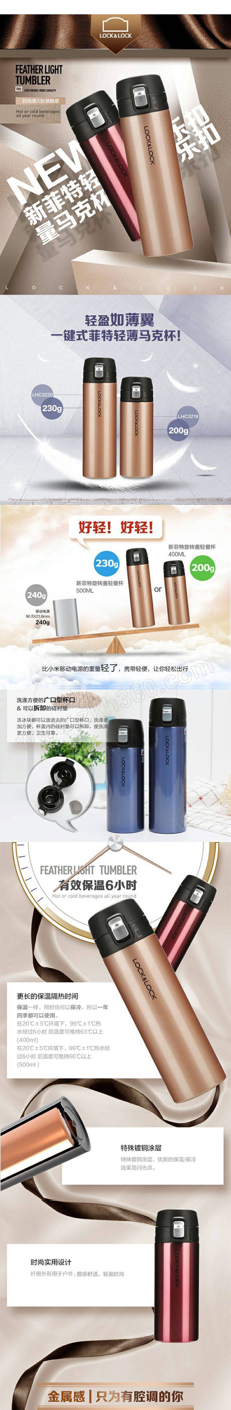 ·轻盈如薄翼,一键式菲特轻薄马克杯! ·新颖的色彩,加上金属质感的一键式按钮,更加凸显了奢华感 ·304不锈钢内胆,材质稳定不易生锈