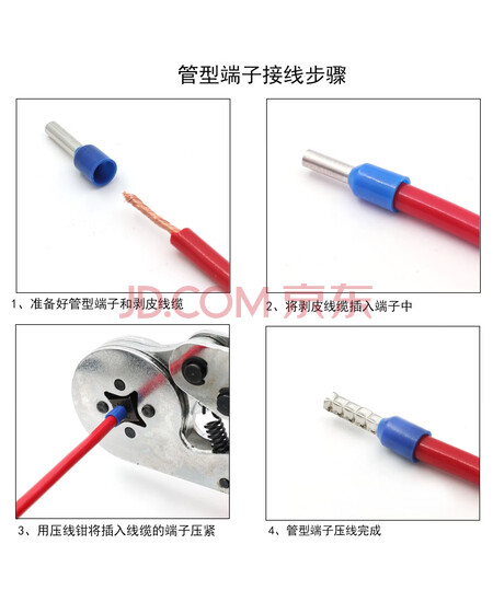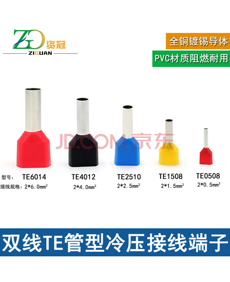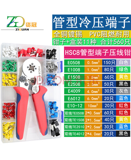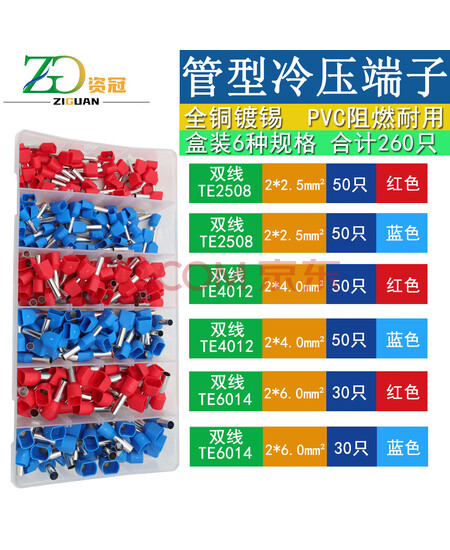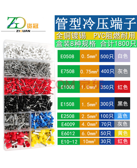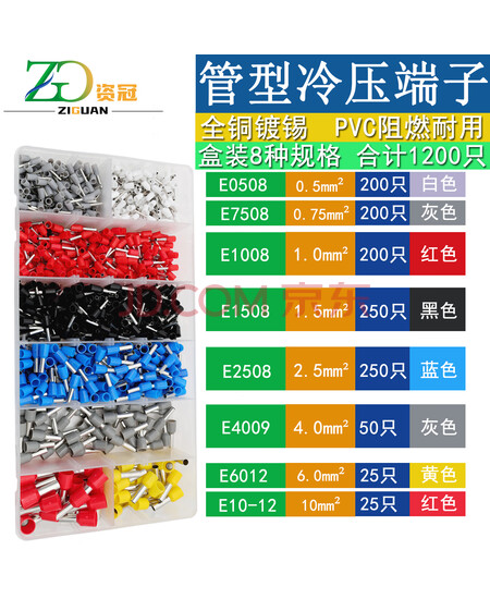 资冠 针型管型接线端子盒装冷压端头VE端子铜鼻子电线接头插针并线压线耳 8种规格1200只